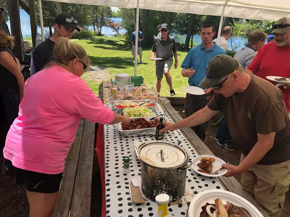 The Traditional Shore dinner dates back to the late 1800’s when oarsmen, now know as guides would row passengers in their skiffs to and from fishing grounds. Stopping midday at an island they would cook a noonday meal of the morning’s catch. The menu consists of bacon lettuce tomato sandwich appetizers, tossed salad with Thousand Island dressing, fresh pan fried fish, salt potatoes, guide’s famous French toast for dessert accompanied with guides coffee.